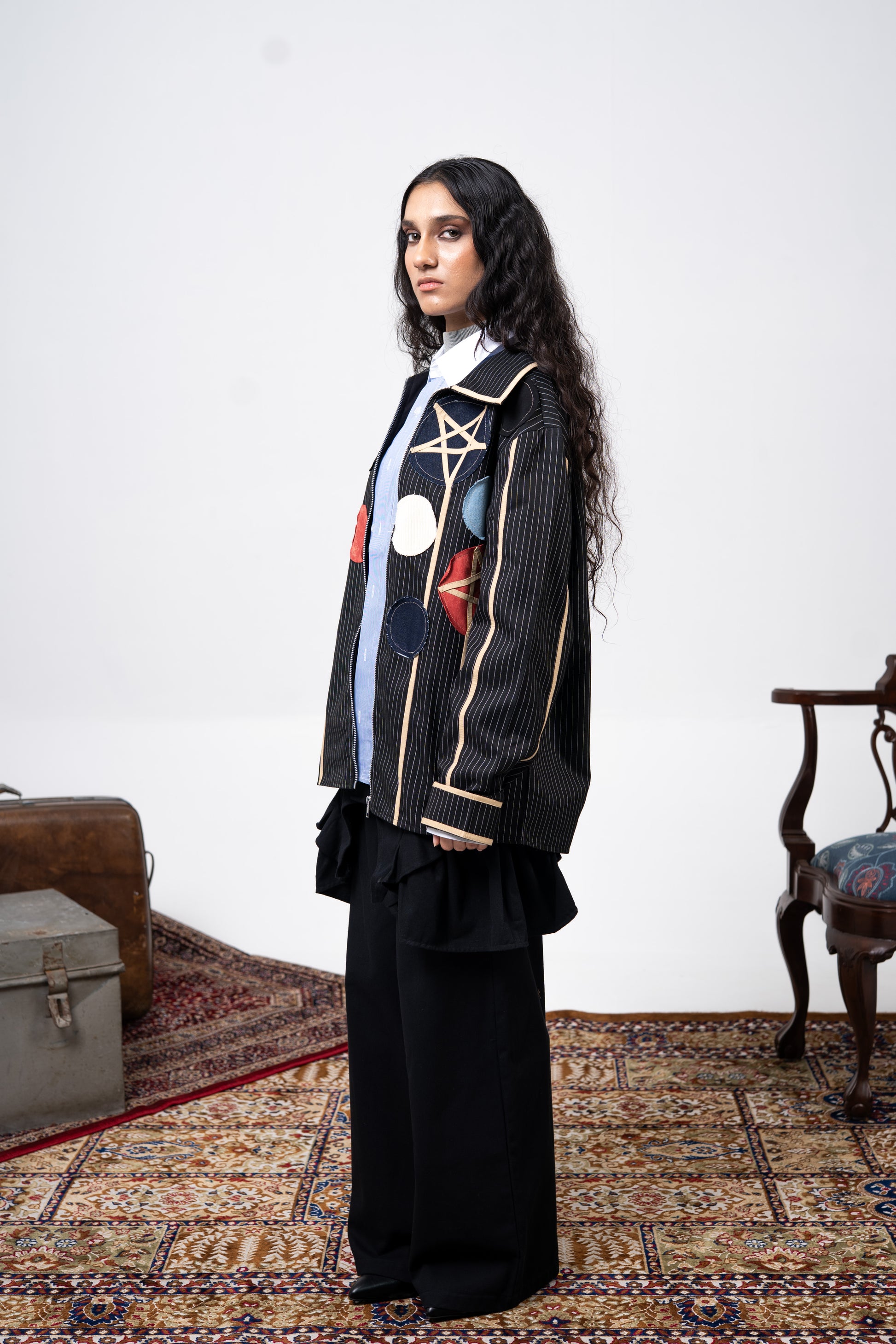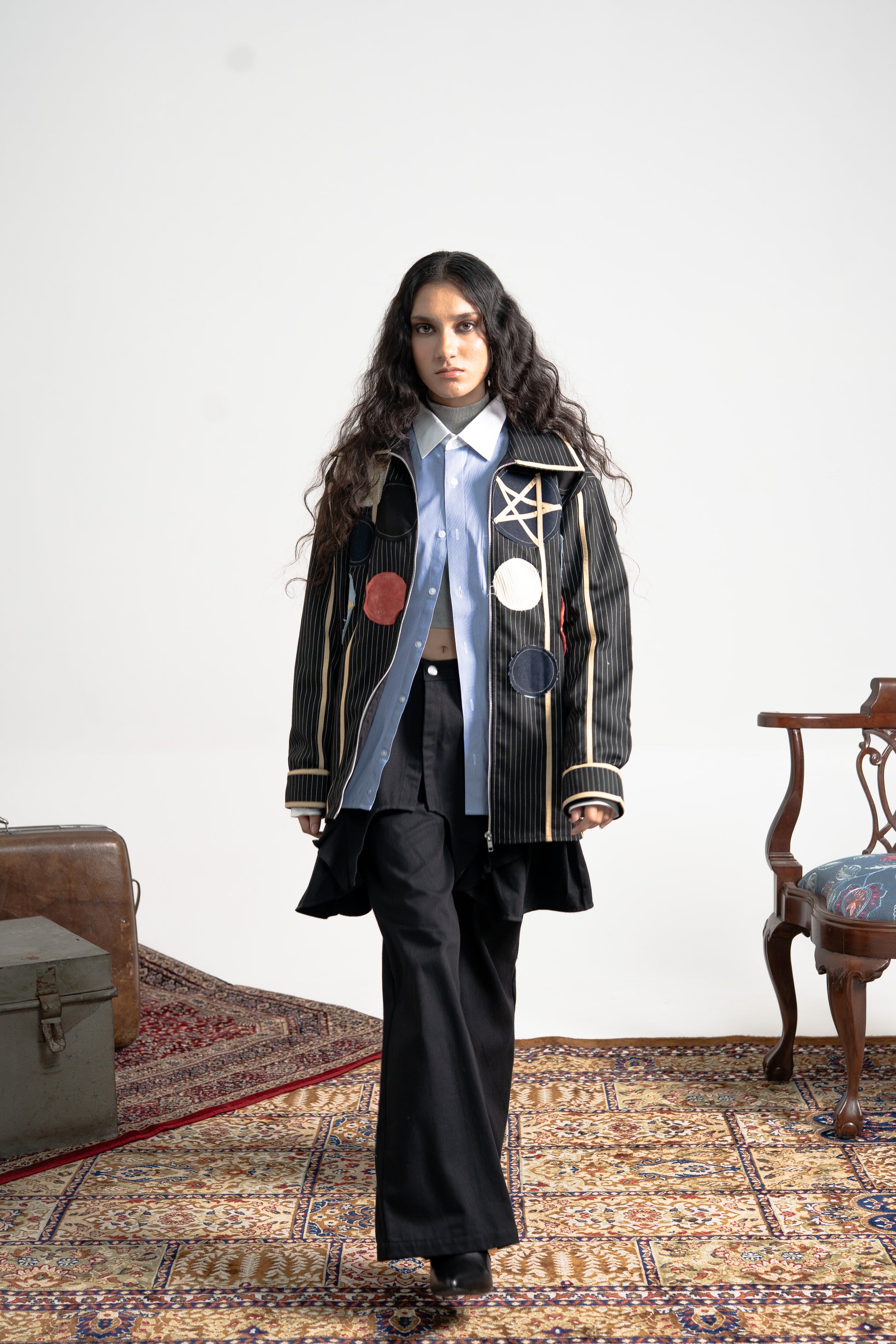 The contrast between the structured pants and the gently draped upper layer adds dimension and movement, giving the piece a contemporary, layered look that is both expressive and effortlessly wearable. It is finished with a metallic zipper, pockets for utility and button closure.