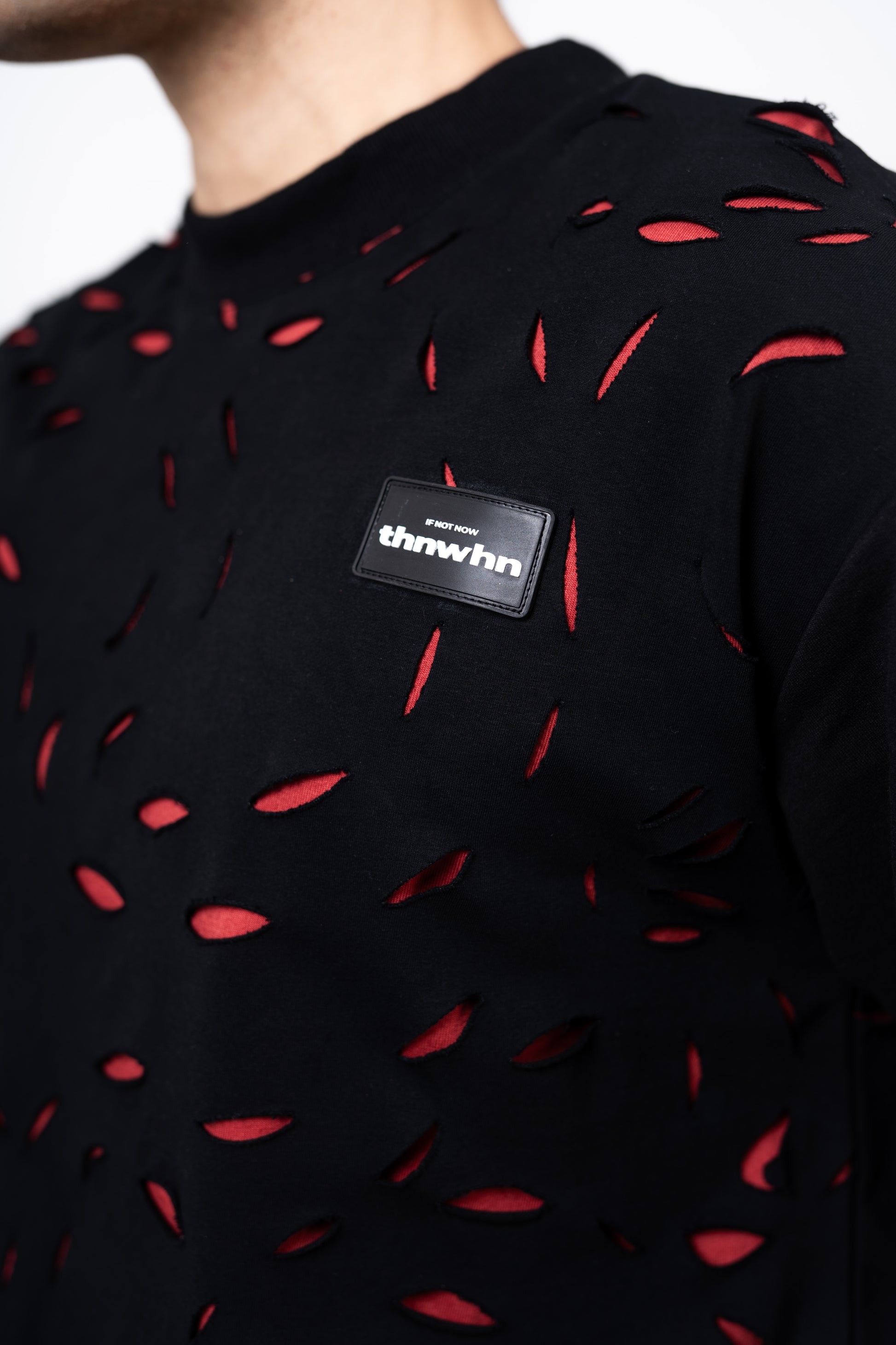 Crafted in two layers of cotton single jersey in black and scarlet, the cuts allow the red beneath to peek through like quiet strength beneath the surface. Finished in a half-sleeve silhouette, this tee blends symbolism, texture, and storytelling into a bold, expressive everyday piece.