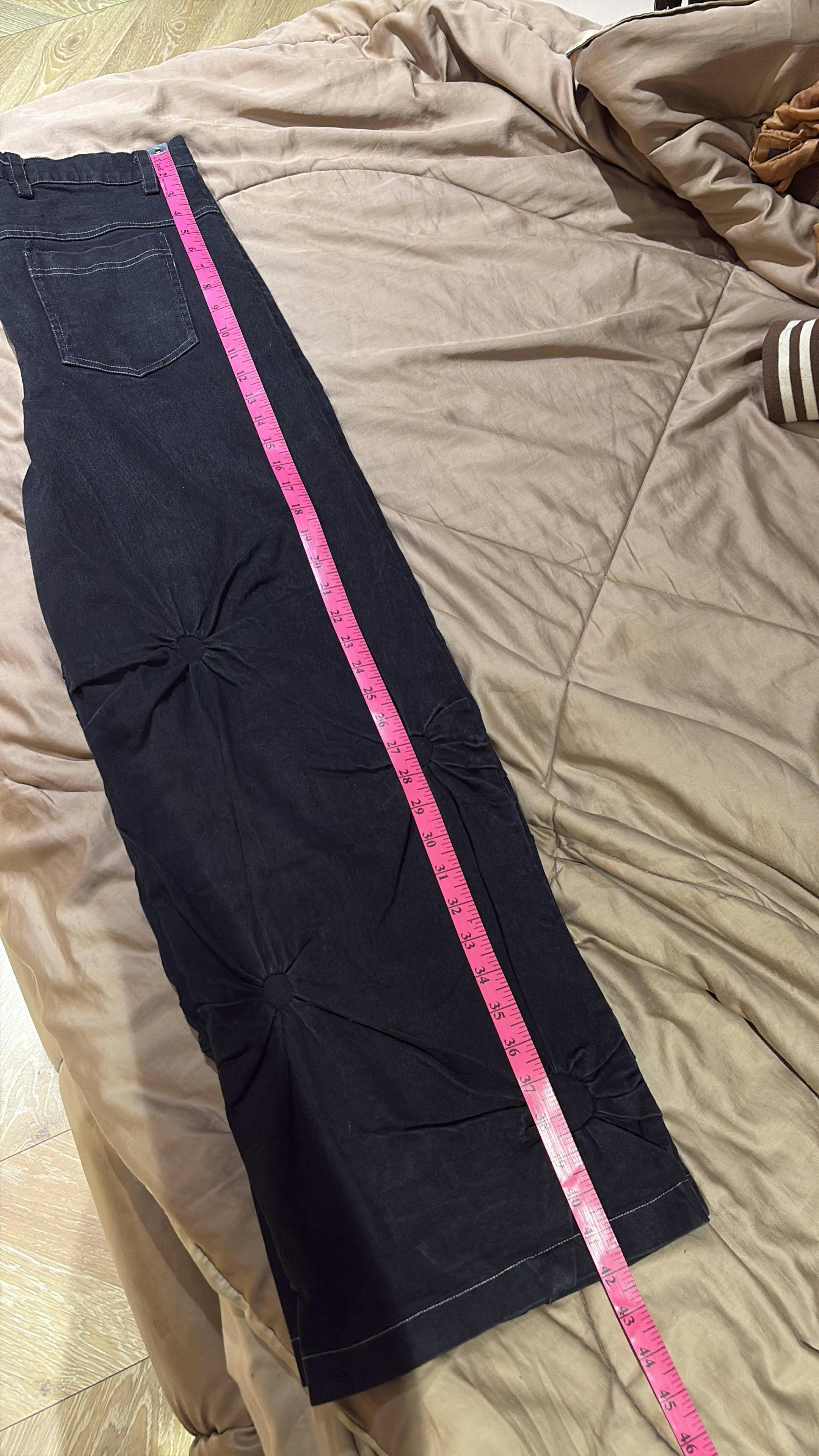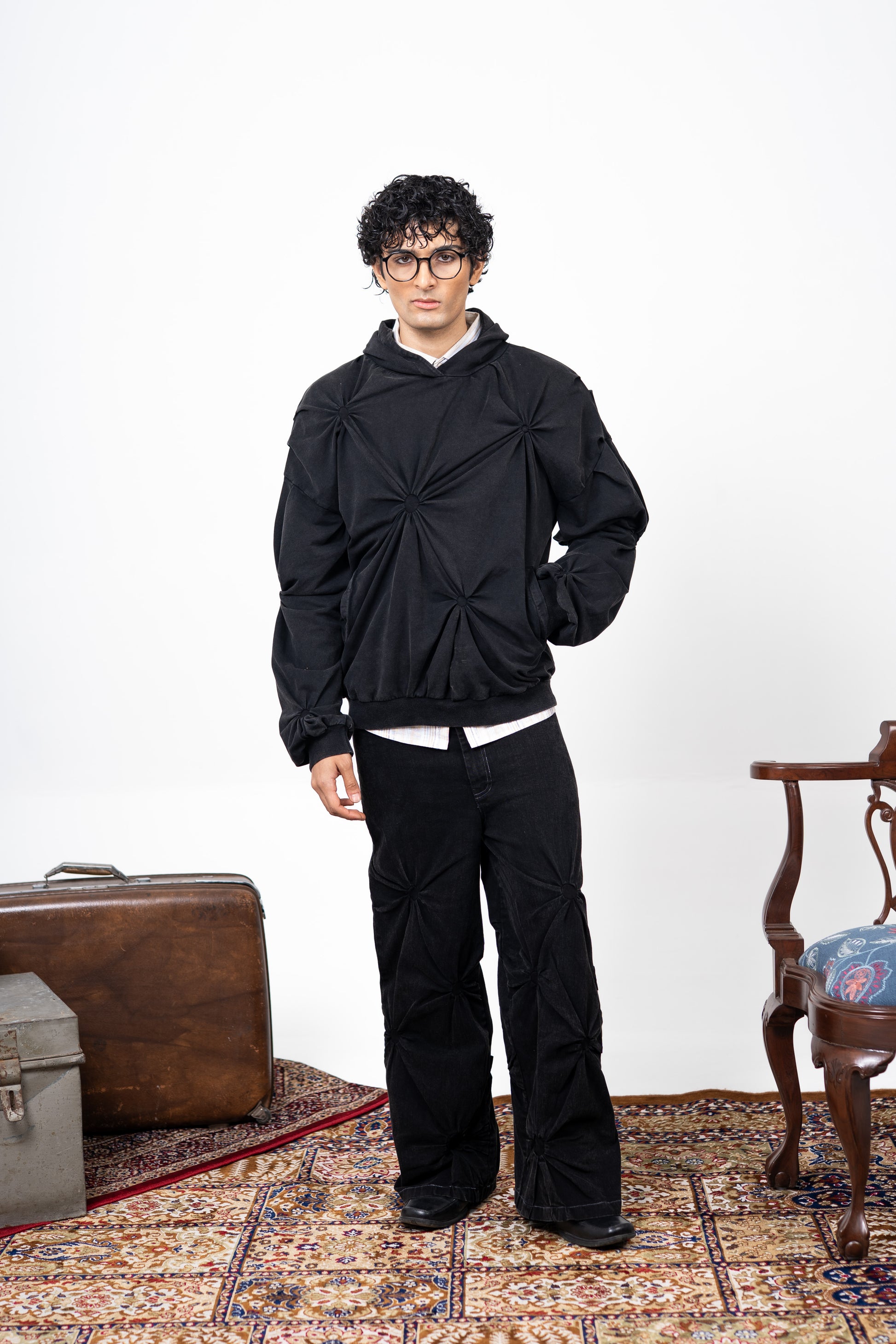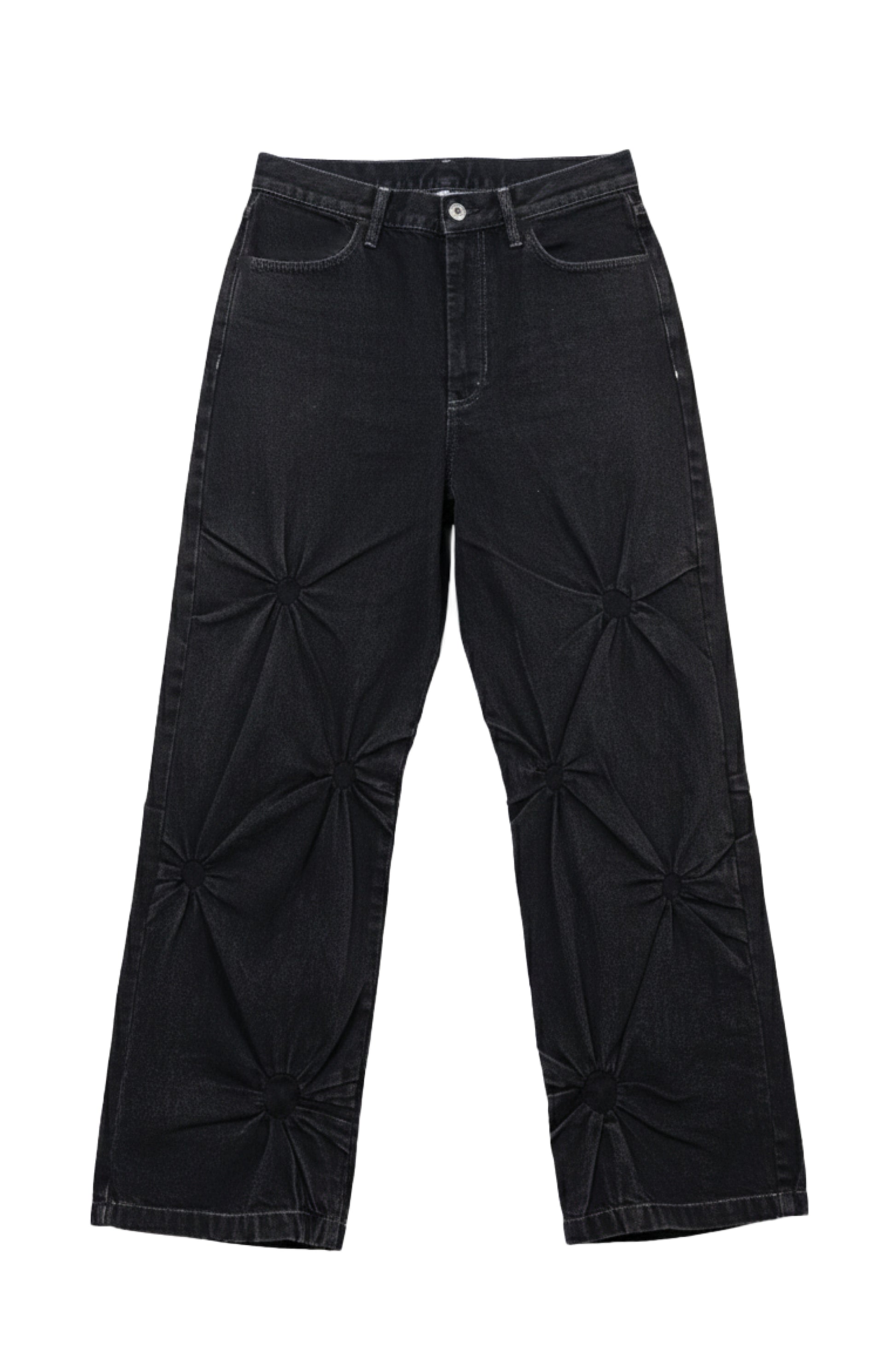Meticulously engineered circular fabric manipulation gives the Revolution jeans it’s unique silhouette. With each circle crafted from hands that showcases artisanal skill enhanced through acid wash on a black overdyed denim base.